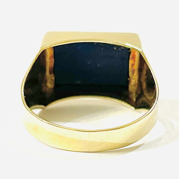 Elegantní, robustnější pánský prsten, hlavici dominuje přírodní lapis lazuli obdélného plochého brusu, široká ramena šíny s plastickým organickým dekorem poplatném dobovému brutalismu. Německá zlatnická práce ze 70. let 20. století. Zhotoveno ze žlutého 14 karátového zlata, tj. o ryzosti 585/1000; nově opatřeno puncem Z-58 (labuť 4), ryzostní číslo a značka výrobce "PL" zevnitř šíny. Hmotnost 5,29 g, velikost 64, délka hlavice 15 mm, šířka 10,5 mm. Kámen velmi lehce uvolněný, není však vadou proti dennímu nošení, celkově jinak v zachovalém stavu.