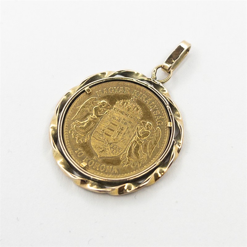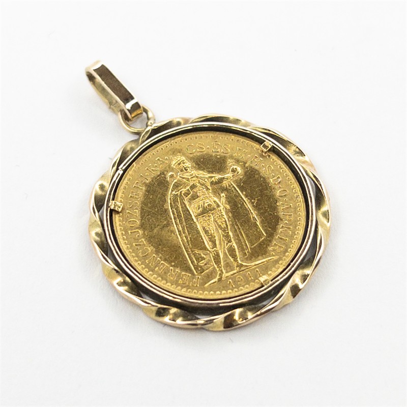 Zlatý přívěs s mincí - desetikoruna, Kremnice, uherská ražba, Rakousko - Uhersko, ročník 1911, Au 900,585/1000 o celkové hmotnosti 5,90 g, průměr přívěsu: 2,2 cm, průměr mince: 1,9 cm