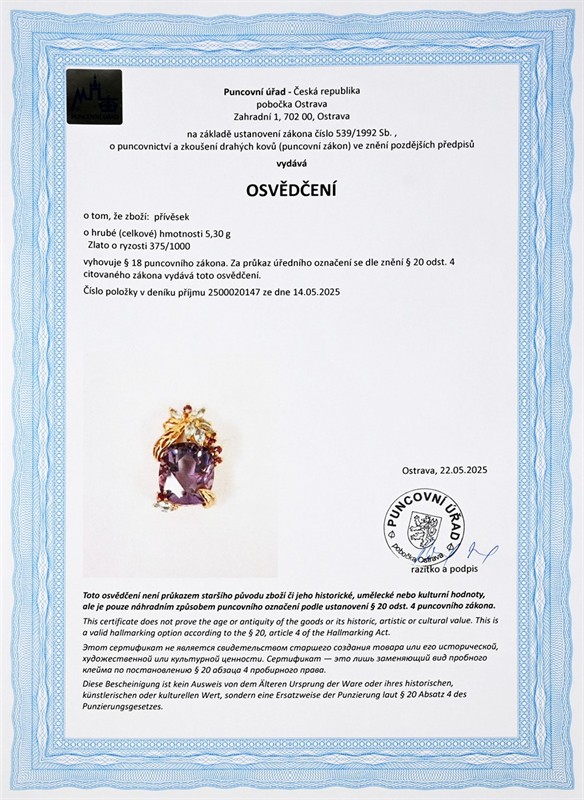 č. 180 216 Zlatý přívěsek s ametystem, topazy a almandiny