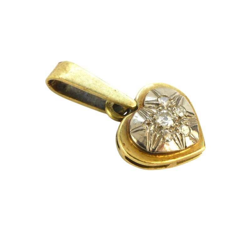 Romantický přívěsek ve tvaru srdíčka ze zlata ryzosti 585/1000 (punc klas) zdobený diamanty briliantového brusu o celkové hmotnosti 0,10 ct. Rozměry 1 x 1,2 cm. závěsné ouško 1 cm. Celková hmotnost 1,73 g.