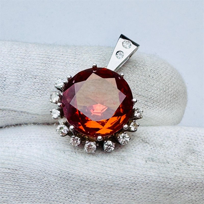 Přívěsek je osazený citrínem o průměru 15 mm, dále je fasováno 12 diamantů briliantového brusu o váze cca. 0,50ct. F-G/ VSI, přívěsek je vyrobeny ze zlata 585/1000 o váze 6,7 gramů. Velikost přívěsku je 29x21mm.