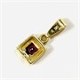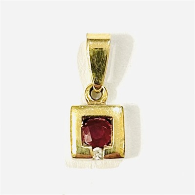 Decentní, moderně pojatý přívěšek ve tvaru čtverce, uprostřed osazeno přírodním rubínem kulatého brusu a decentně doplněno přírodním diamantem kulatého briliantového brusu o váze 0,01 ct. Západoevropská zlatnická práce, patrně z počátku 21. století. Zhotoveno ze žlutého 14 karátového zlata, tj. o ryzosti 585/1000; nově opatřeno puncem Z-58 (labuť 4), ryzostní číslo a značka "D" (značící osazení diamantem) na očku. Hmotnost 1,13 g, celková délka 15 mm, šířka 6,5 mm. V zachovalém stavu.
