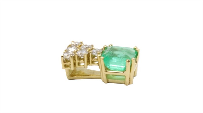 Zlatý přívěsek s diamanty a smaragdem. Žluté zlato 750/1000. Přírodní diamanty, kvalita SI1 - SI2, barva G - I, celková váha 0,5 ct. Přírodní smaragd 1,85 ct. Váha přívěsku: 3,02 g. Velikost přívěsku: 1,5 x 0,8 cm.
