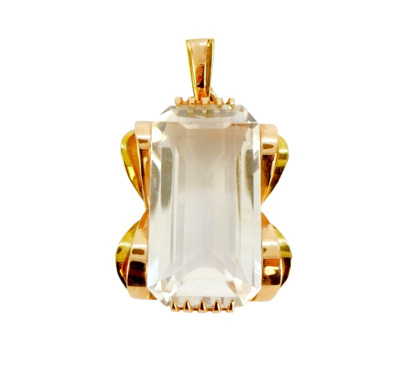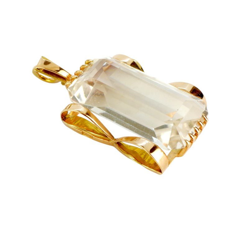 Přívěsek ze žlutého zlata ryzosti 585/1000 s horským křišťálem. Celková hmotnost závěsu je 5,62 g. Délka včetně závěsného očka je 3,2 cm. Řetízek není součástí prodeje, pouze závěs.