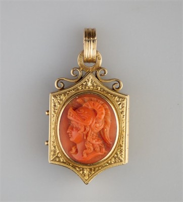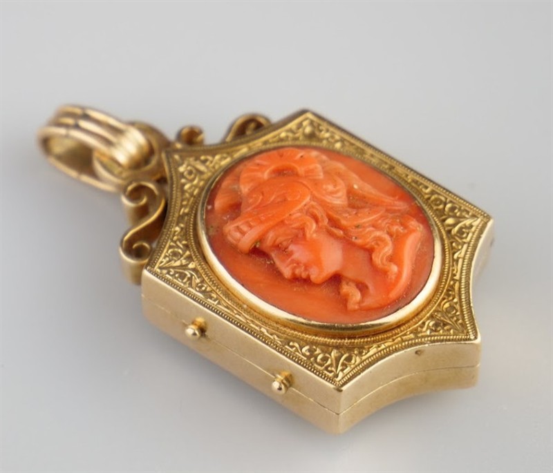 Zlatý noblesní historizující přívěsek – medailon s korálovou vysokoreliéfní gemou, zobrazující řeckou bohyni moudrosti a války Athénu. Celková hmotnost Au 22,68 g/580/1000, punc liška (Z – 27), Praha, mistrovská značka v kartuši PV, České království. Otevírací medailon ve tvaru nepravidelného šestiúhelníku, zadní strana s průhledem z oválného sklíčka, zdoben jemným gravírováním. Přírodní korál velmi dobré kvality, znalecký posudek. Luxusní reprezentativní šperk ve výborném stavu ze třetí čtvrtiny 19. století. Délka závěsu s ouškem 5,2 cm, bez ouška 4,4 cm, šířka závěsu 2,5 cm, výška 1,5 cm.