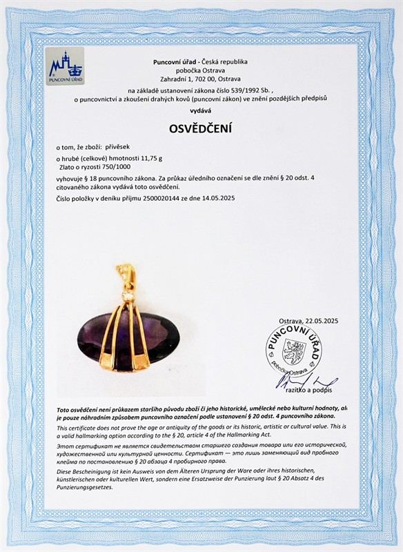 č. 179 624 Zlatý přívěsek s přírodním ametystem a diamantem