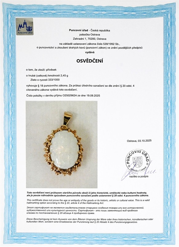 č. 179 760 Zlatý přívěsek s přírodním opálem