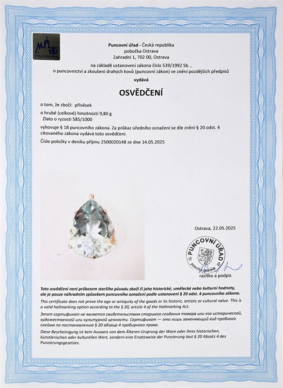 Zlato o ryzosti 585/1000 váha 9,80 g přírodní topaz 1 ks 45 ct výška 3 cm, šířka 1,8 cm osvědčení puncovního úřadu kameny s garancí pravosti zkontrolované v gemologické laboratoři řetízek není součásti aukce