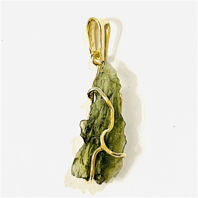 Moderní, naturalistický přívěšek s přírodním surovým vltavínem hrubé struktury, jež je decentně přichycen zlatým drátem. Současná tuzemská autorská zlatnická práce. Zhotoveno ze žlutého 14 karátového zlata, tj. o ryzosti 585/1000; ryzostní číslo a mistrovská značka "ZT" na očku. Hmotnost 1,12 g, celková délka 28 mm, šířka 9 mm. Kámen se úmyslně ve fazóně lehce pohybuje, stav nový, tedy intaktní.
