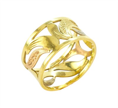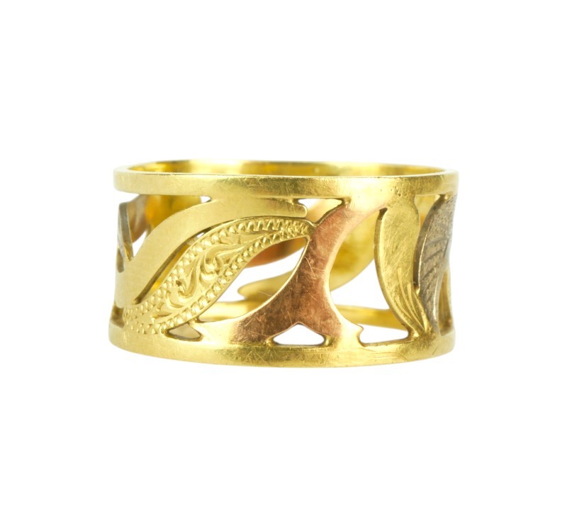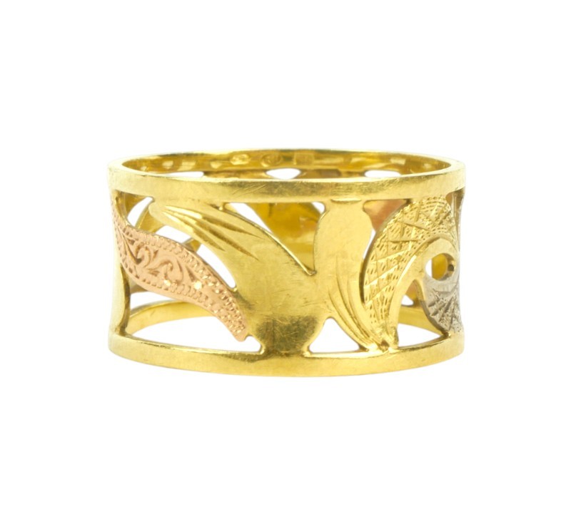 Prsten ze zlata ryzosti 585/1000 (punc labuť) zdobený jemným prořezáváním. Velikost prstenu cca 56. Celková hmotnost 3,52 g.