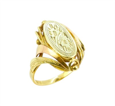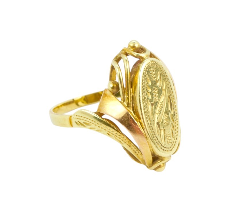 Prsten vyrobený ze zlata ryzosti 585/1000 zdobený jemným gravírováním. Značen mistrovskou značkou MK. Velikost 62. Hmotnost 4,85 g.