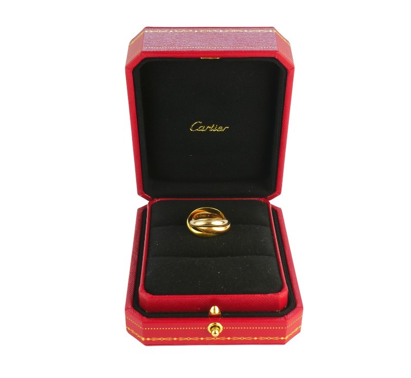 Prsten Trinity značky Cartier je zhotoven ze tří kroužků - z bílého, žlutého a růžového zlata ryzosti 750/1000. K prstenu je originální Cartier krabička. Celková hmotnost je 8,15 g. Velikost 51.