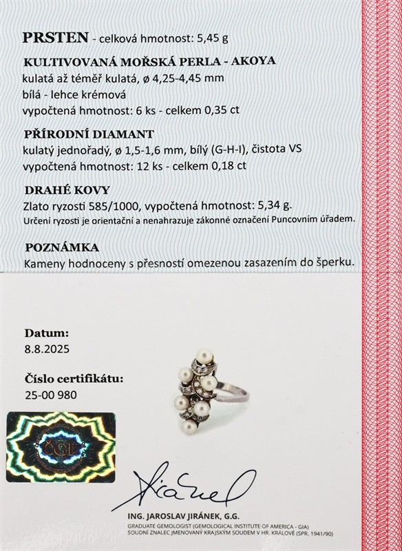 Bílé zlato o ryzosti 585/1000 váha 5,45 g přírodní diamanty 12 ks 0,18 ct, bílý (G-H-I), čistota VS kultivované mořské perly Akoya 6 ks 0,35 ct, bílé - lehce krémové, průměr 4,25-4,45 mm průměr 4,9-4,95 mm velikost 58 výborný stav míry hlavy 2,4 x 1,1 cm osvědčení puncovního úřadu certifikát z gemologické laboratoře je součástí šperku