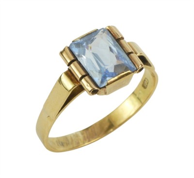 Zlatý Art Deco prsten s akvamarínem, zlato ryzost 585/1000, hmotnost 1,94 g. Velikost prstenu 49. Půvabný prsten na štíhlý prst ve výborném stavu.