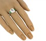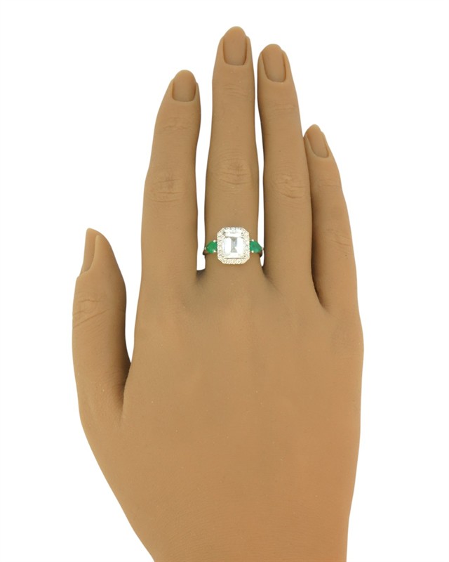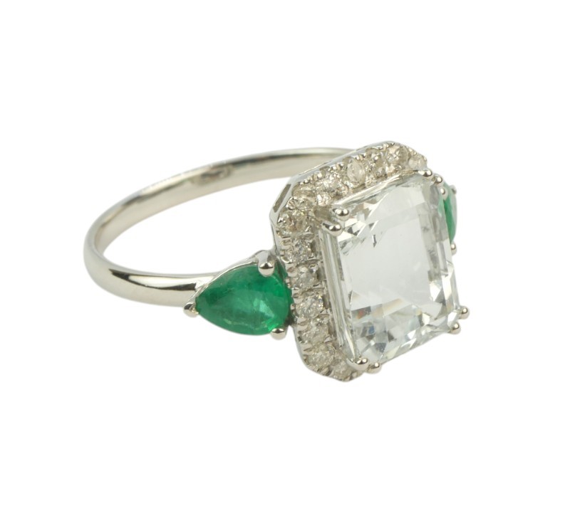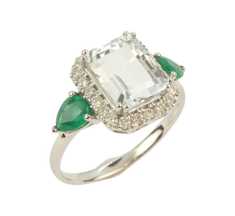 Prsten z bílého zlata ryzosti 585/1000 osazený smaragdy o celkové hmotnosti 0,50 ct, diamanty briliantového brusu o celkové hmotnosti 0,30 ct a velkým přírodním akvamarínem o hmotnosti 1,60 ct. Celková hmotnost prstenu je 2,87 g. Velikost 56.
