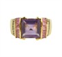 Prsten ze žlutého zlata ryzosti 585/1000 zdobený fialovým ametystem, po stranách jsou zasazeny drobounké růžové ametysty a brilianty. Velikost prstenu 54, celková hmotnost 5,64 g.