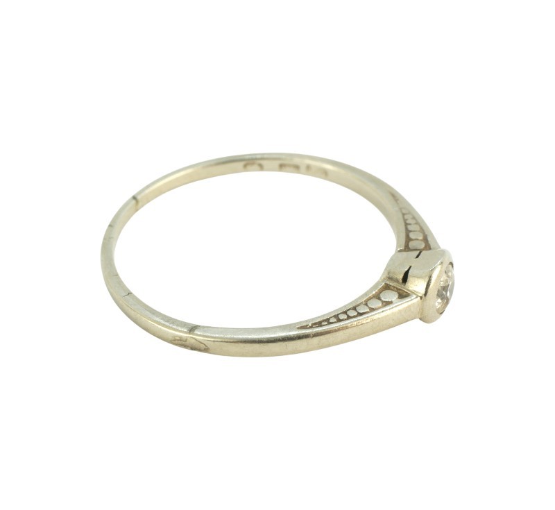 Prsten z bílého zlata ryzosti 585/1000 (punc lvíček) zdobený diamantem briliantového brusu hmotnosti 0,10 ct. Velikost prstenu 56, celková hmotnost 1,44 g.