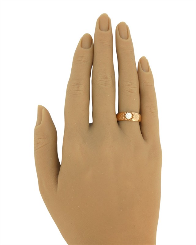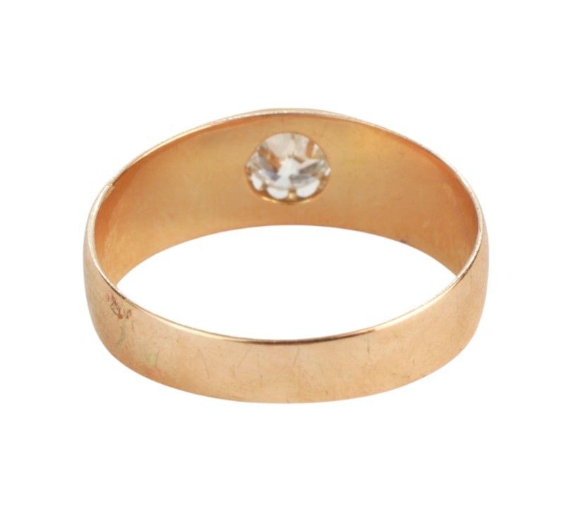Prsten z růžového zlata ryzosti 585/1000 je osazen diamantem hmotnosti cca 0,40 ct, obroučka po stranách zdobena gravírováním. Rakousko-Uhersko. Celková hmotnost prstenu je 2,58 g a jeho velikost je 56.