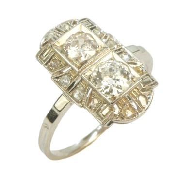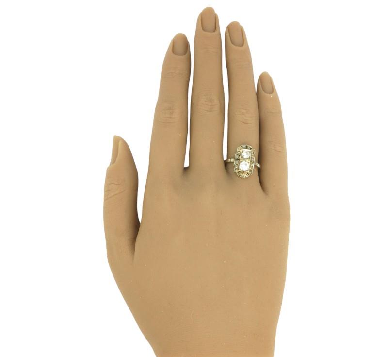 Starožitný zlatý prsten s brilianty 0,73 ct Zlato ryzost 585/1000, hmotnost prstenu 2,47 g. Prsten je osazen dvěmi středovými brilianty o hmotnosti 0,37 ct a 0,24 ct a diamantovými routami. Velikost prstenu 54.