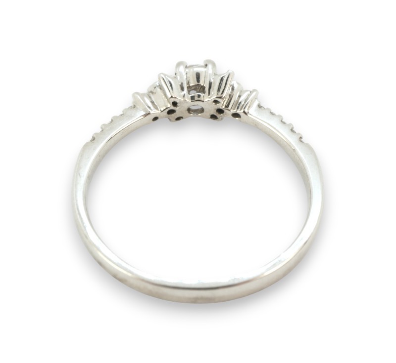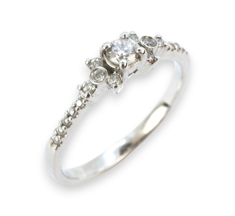 Prsten z bílého zlata ryzosti 585/1000 s diamanty briliantového brusu o celkové hmotnosti 0,25 ct. Celková hmotnost prstenu je 2,10 g. Velikost 54.