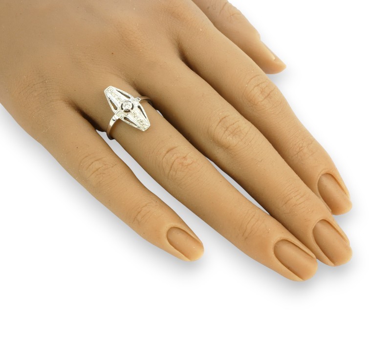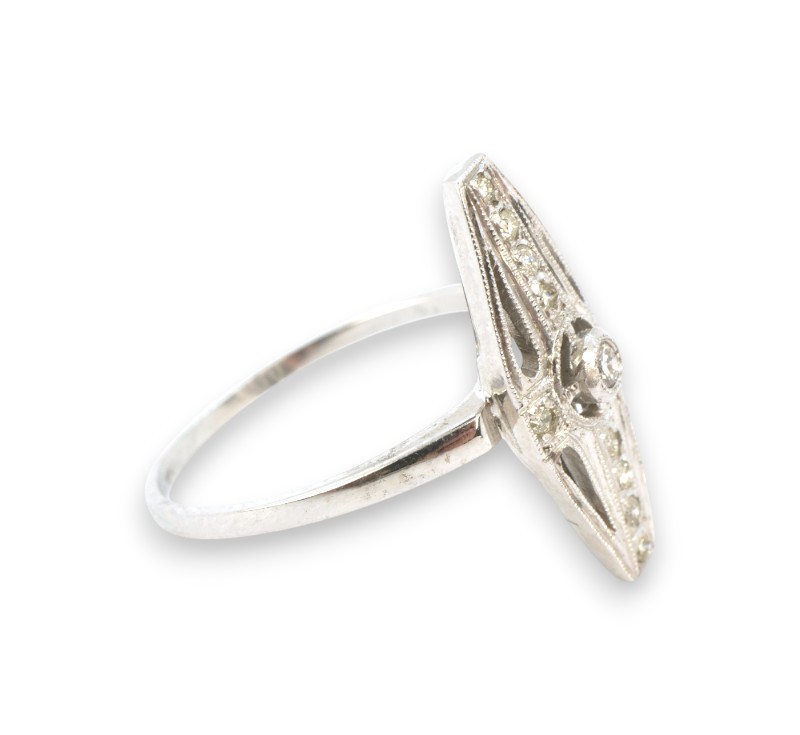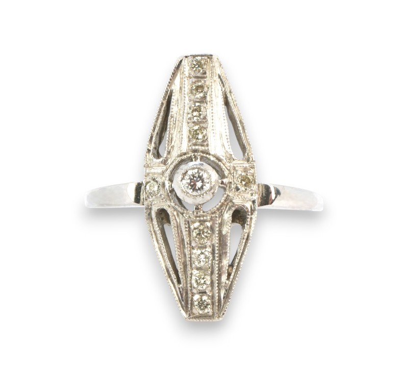 Prsten z bílého zlata ryzosti 585/1000 s diamanty briliantového brusu o celkové hmotnosti 0,15 ct. Celková hmotnost prstenu je 2,70 g. Velikost 53.