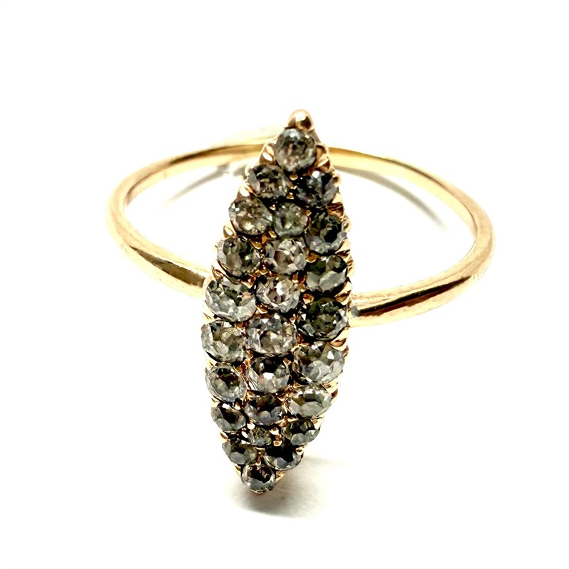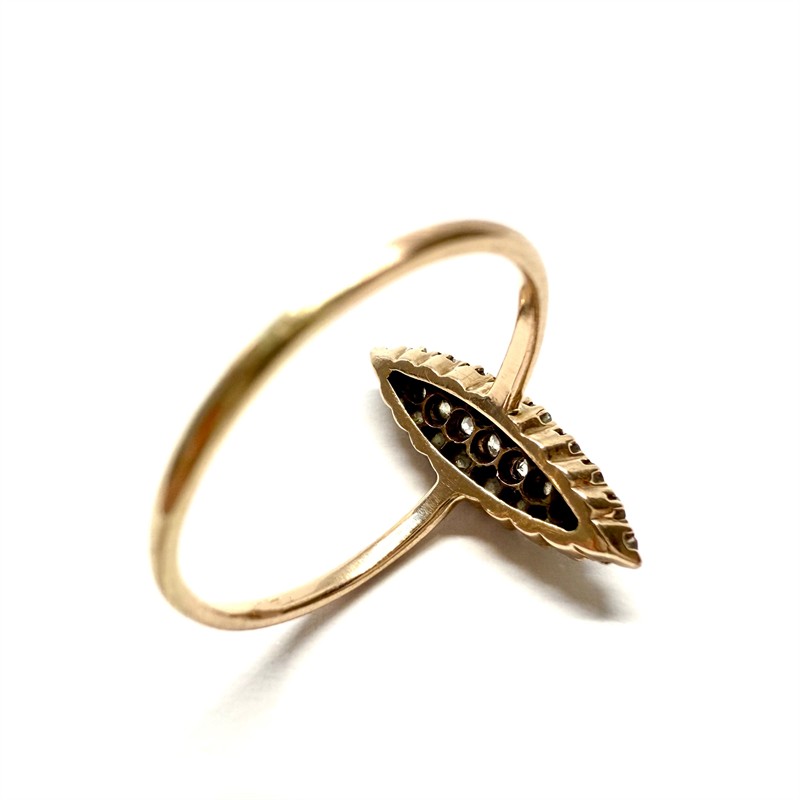 Půvabný zlatý prsten s brilianty. Šperk byl vyroben ze zlata růžového odstínu ryzosti 560/1000. Hlava prstenu je celá osázená brilianty starého brusu. Jedná se o 25 přírodních briliantů pyšnících se vysokou brilancí. Celková váha šperku 2,16 g. Velikost 55. Perfektní stav.