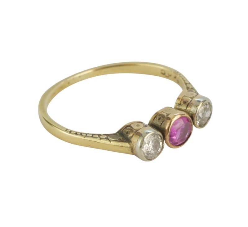 Secesní zlatý prsten s rubínem a brilianty 0,20 ct, zlato o ryzosti 580/1000 o celkové hmotnosti 1,30 g, velikost prstenu: 48 (velikost lze na přání upravit). Atest Puncovního úřadu.