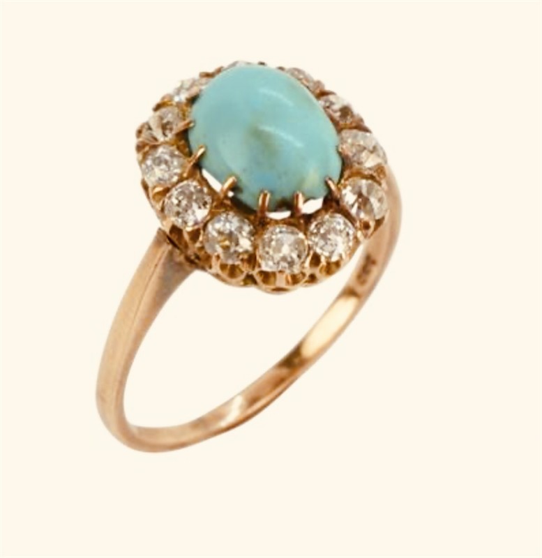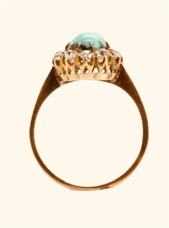 Krásný Prsten ze žlutého zlata s brilianty , Prsten zdobí přírodní tyrkys a brilianty celkové hmotnosti cca 1,0 ct. , Zlato o ryzosti nižší než 585 / 1000 s platným puncem, Velikost prstenu 57, celková hmotnost 3,23 g, Krásná původní práce ,odborně vyčištěno zlatníkem
