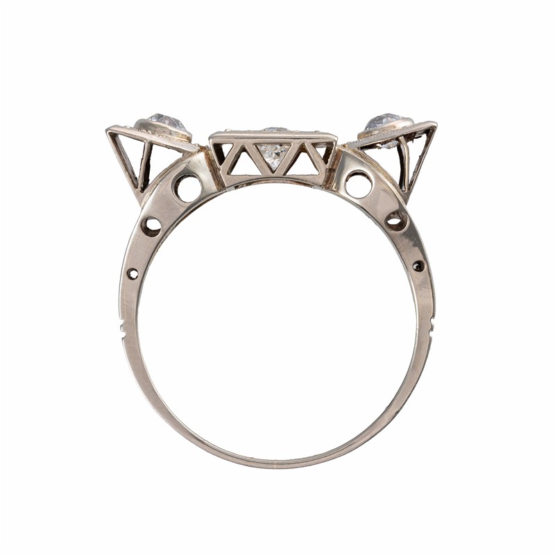 Žluté zlato o ryzosti 585/1000 váha 4,81 g přírodní diamant Old Europe 1 ks 0,25 ct, výjimečně bílý (D-E-F), čistota I1 přírodní diamant Old Europe 2 ks 0,38 ct, výjimečně bílý (D-E-F), čistota SI1-SI2 velikost prstenu 58 míry hlavy 2,2 x 0,8 cm r. 1930 puncované platným puncem certifikát z gemologické laboratoře je součástí šperku