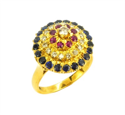 Grandiózní prsten vyrobený ze zlata ryzosti 750/1000 zdobený brilianty, rubíny a safíry. Velikost 54. Celková hmotnost 9,56 g.