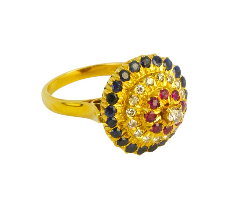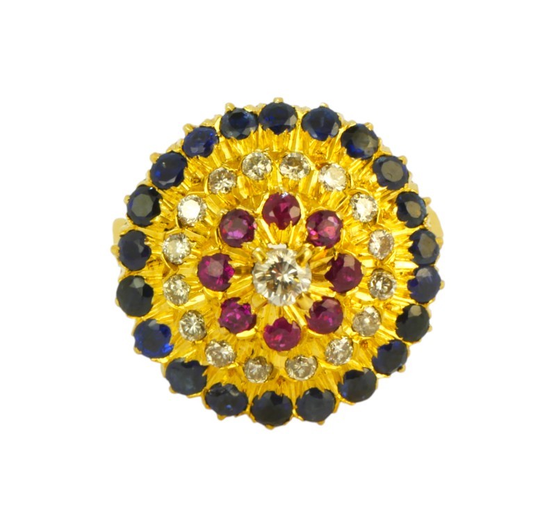 Zlatý prsten s brilianty, rubíny a safíry