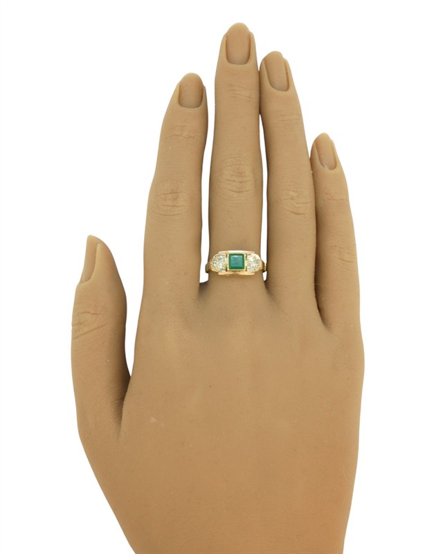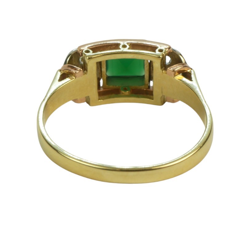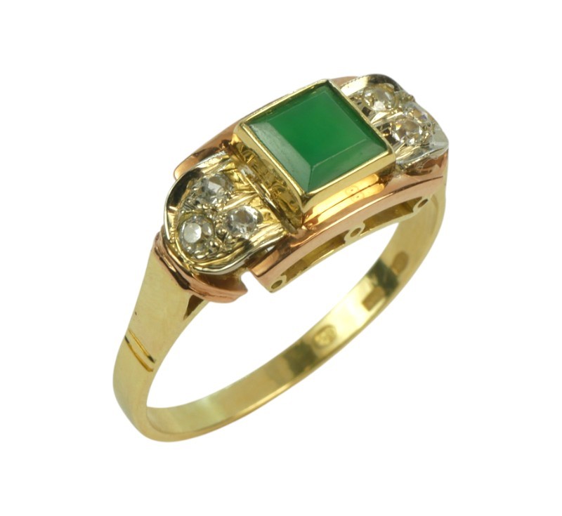 Prsten ze žlutého zlata ryzosti 585/1000 (punc lvíček) zdobí chrysopras a čiré kamínky. Velikost prstenu 57, celková hmotnost 3,34 g. Pěkná prvorepubliková práce.