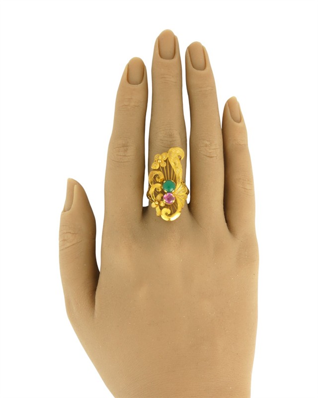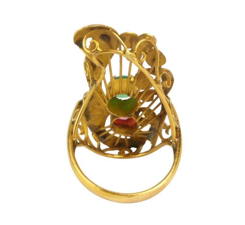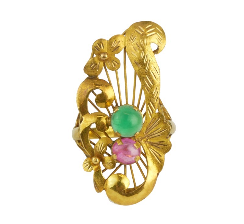 Nepřehlédnutelný originální prsten z vysokoryzostního žlutého zlata (850/1000), zdoben růžovým kamenem a chrysoprasem. Celková hmotnost prstenu je 6,62 g. Velikost 52. Vyhotoveno osvědčení Puncovního úřadu.
