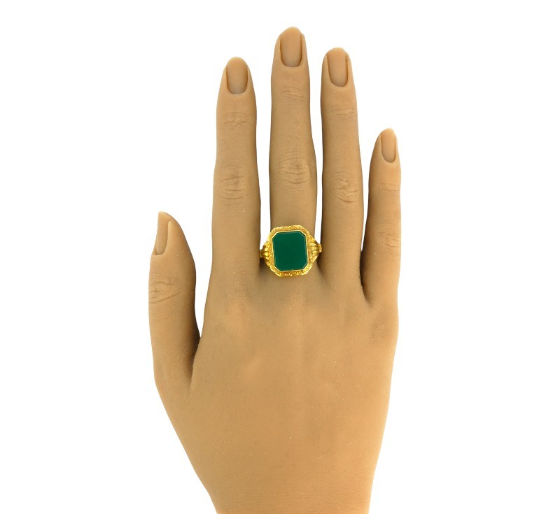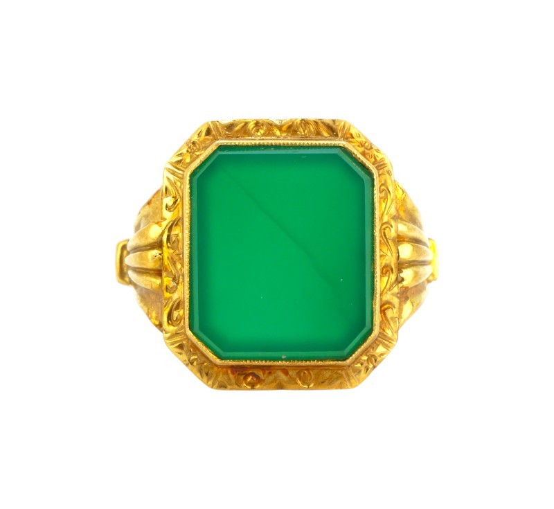 Robustní prvorepublikový prsten vyrobený ze zlata ryzosti 585/1000 (punc lvíček) zdobený velkým chryzoprasem a jemným gravírováním. Rozměr hlavy 1,8 x 1,6 cm. Velikost 70. Hmotnost 4,52 g.