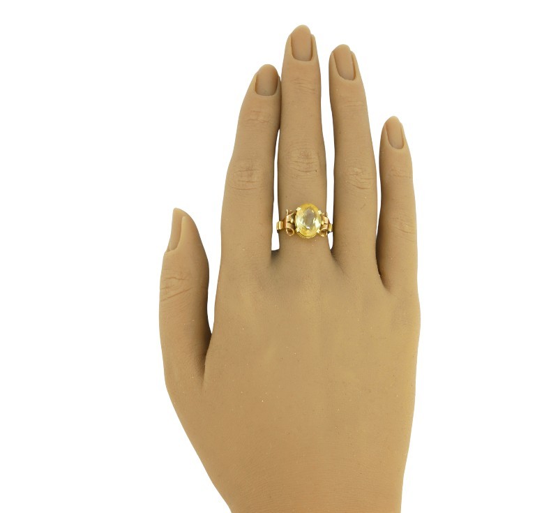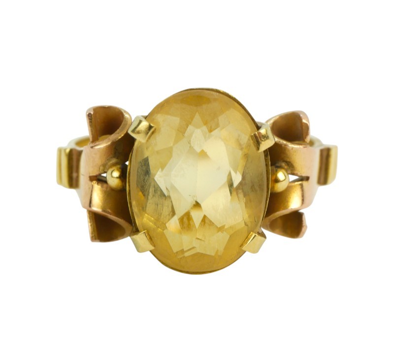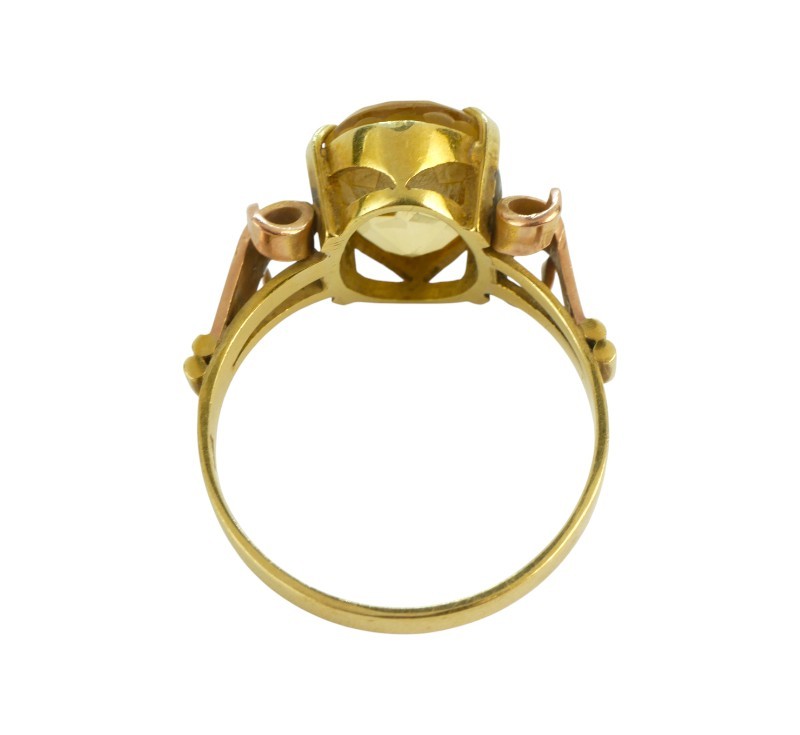 Prsten ze zlata ryzosti 585/1000 zdobený krásným velkým citrínem. Velikost prstenu 57. Rozměr hlavy prstenu 1,2 x 1,0 cm. Celková hmotnost 4,18 g.