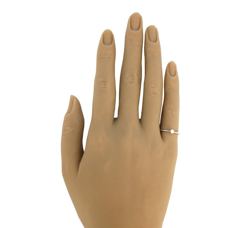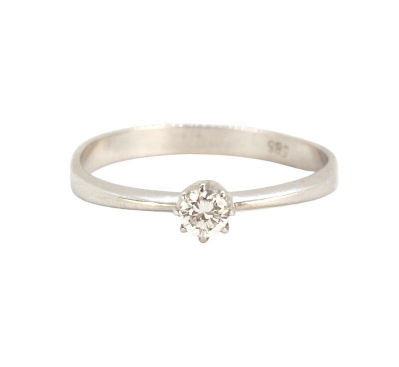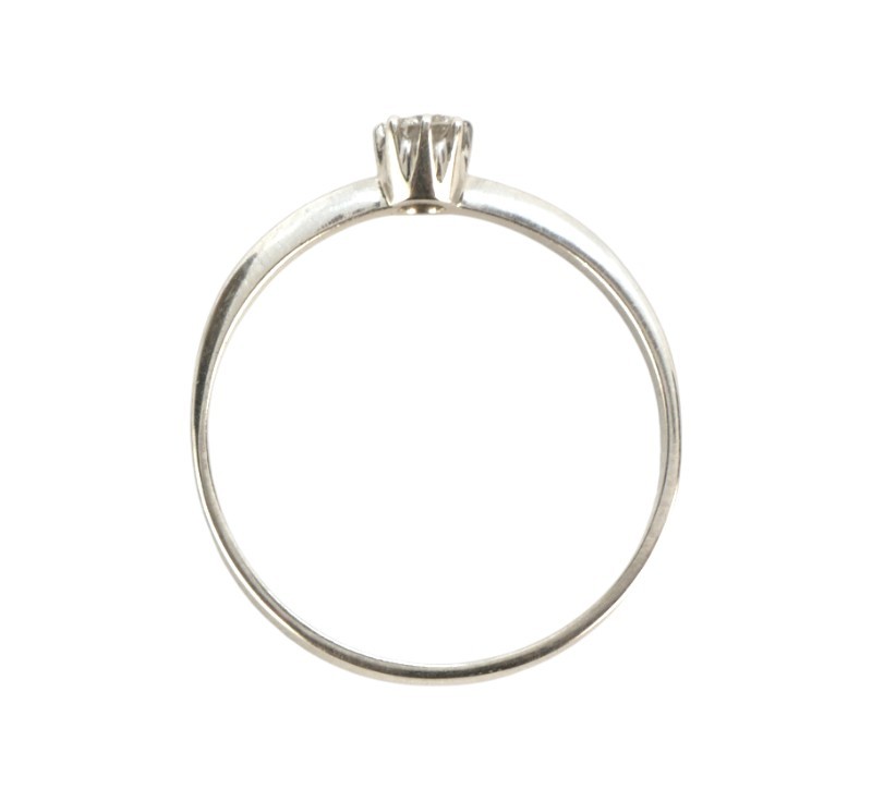 Prsten vyrobený z bílého zlata ryzosti 585/1000 (punc labuť) s diamantem hmotnosti 0,05 ct. Velikost 53. Celková hmotnost 1,20 g.