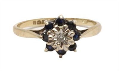 Zlatý prsten s diamantem a safíry. Žluté zlato 375/1000. Přírodní safíry, celková váha 0,24 ct. Přírodní diamant, kvalita I1, barva I - J, celková váha 0,015 ct. Váha prstenu: 1,29 g. Velikost prstenu: 49,5.