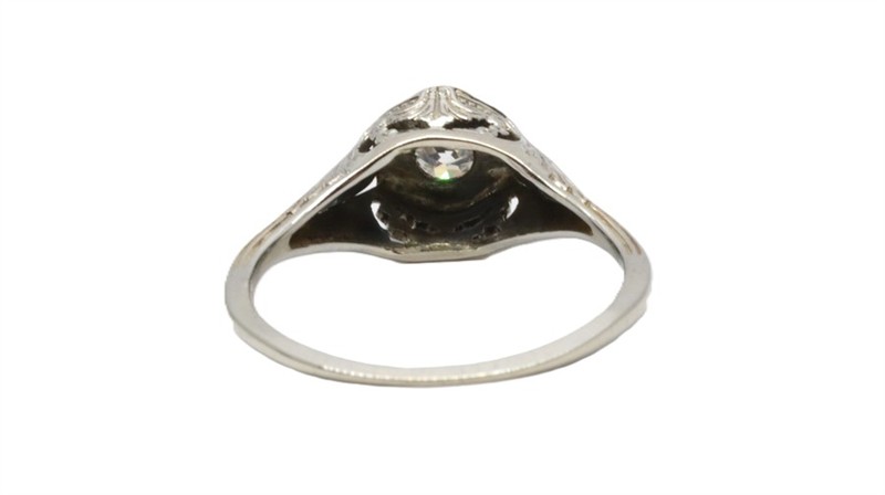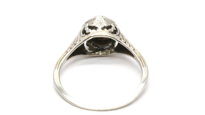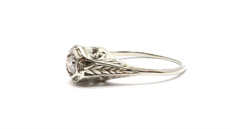 Zlatý prsten s diamantem Art Deco. Bílé zlato 750/1000. Přírodní diamant - starý brus, kvalita SI1, barva H - I, celková váha 0,22 ct. Váha prstenu: 2,35 g. Velikost prstenu: 54.