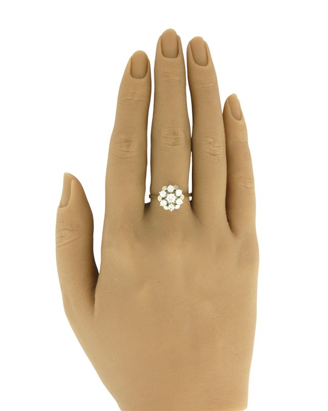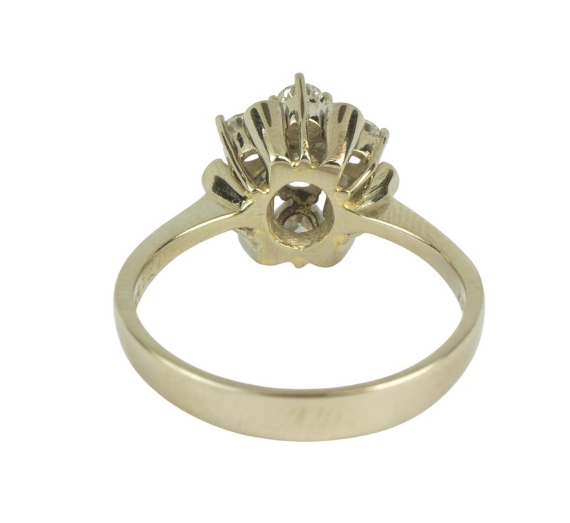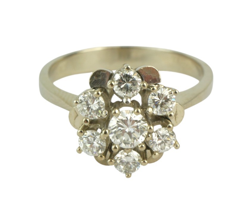 Elegantní, apartní prsten s hlavicí ve tvaru kulatého květu, osazeno přírodními diamanty kulatého briliantového brusu o celkové váze 0,68 ct (0,20 ct - 1 ks; 0,08 ct - 6 ks), kvalita velmi dobrá. Fasováno v krapnových korunách v kombinaci s opticky efektními ploškami. Precizní západoevropská klenotnická práce z poslední čtvrtiny 20. století. Zhotoveno z bílého 14 karátového zlata, tj. o ryzosti 585/1000; nově opatřeno puncem Z-58 (labuť 4), ryzostní číslo, značka "280" a vyryto "0,76 ct" zevnitř šíny. Hmotnost 4,20 g, velikost 56, průměr hlavice 12 mm. V zachovalém stavu, odborně vyčištěno a vyleštěno zlatníkem. Součástí odborný posudek.