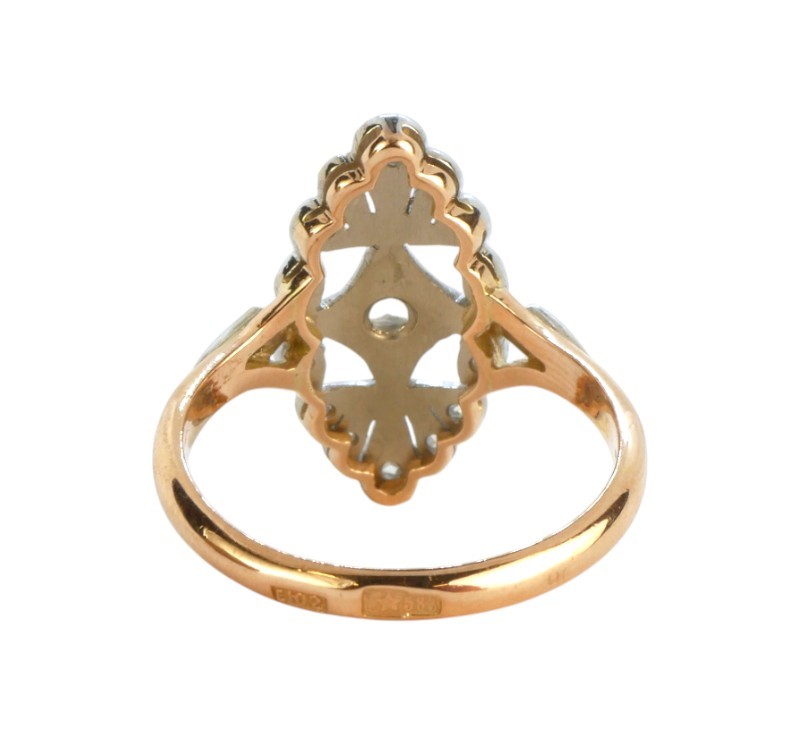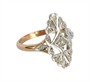 Elegantní prsten vyrobený z bílého a růžového zlata ryzosti 585/1000 (punc labuť) zdobený diamanty (cca 0,20 ct). Celková hmotnost 3,64 g. Rozměry hlavy 2,0 x 1,5 cm. Velikost prstenu 56.