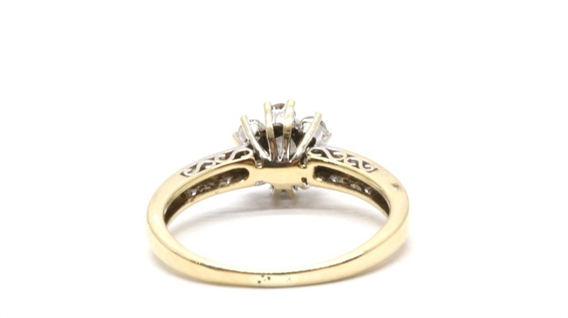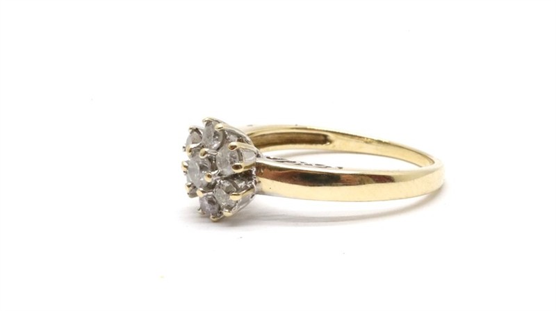 Zlatý prsten s diamanty. Žluté zlato 375/1000. Přírodní diamanty, kvalita I1 - I3, barva H - I, celková váha 0,4 ct. Váha prstenu: 2,18 g. Velikost prstenu: 51,5.
