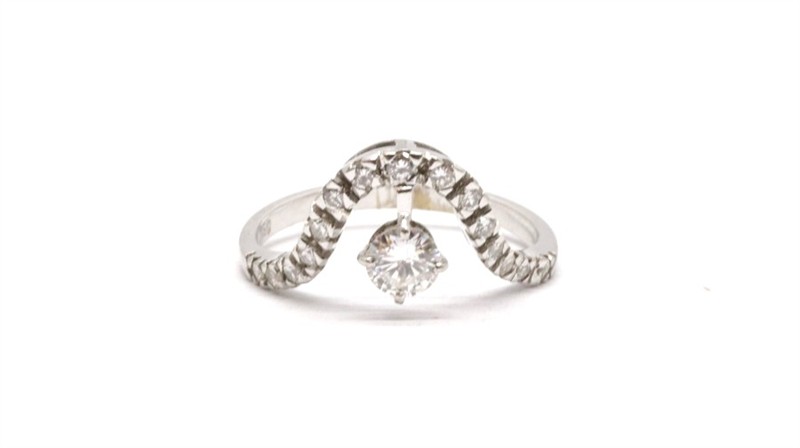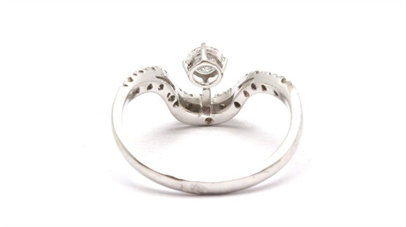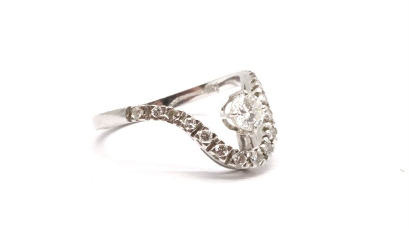 Zlatý prsten s diamanty. Bílé zlato 750/1000. Přírodní diamanty, kvalita SI1 - SI2, barva H - I, celková váha 0,5 ct (centrální diamant 0,25 ct). Váha prstenu: 2,59 g. Velikost prstenu: 53.