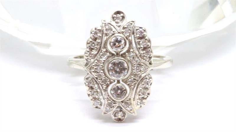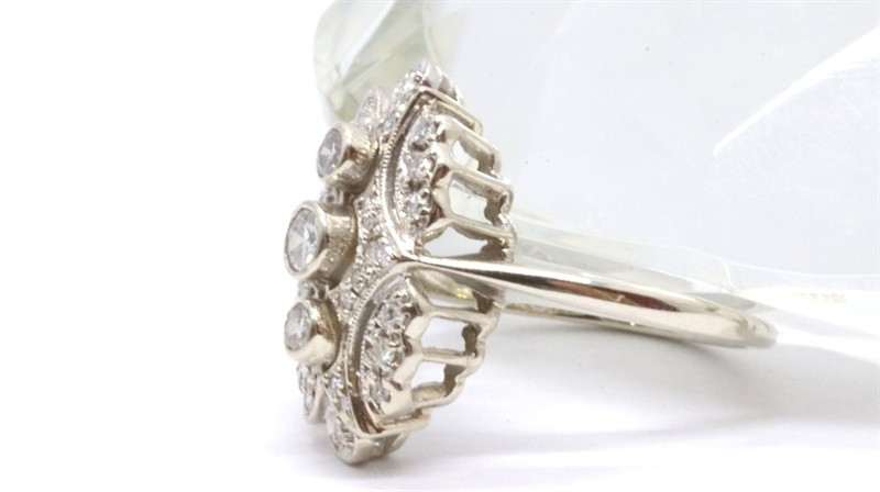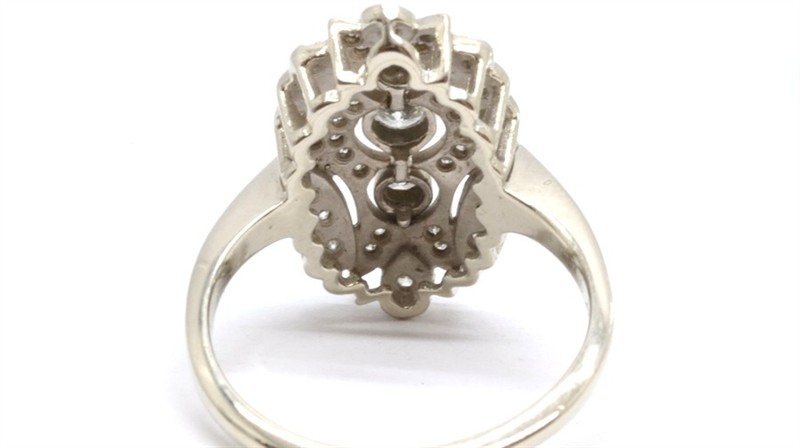 Zlatý prsten s diamanty. Bílé zlato 585/1000. Přírodní diamanty, kvalita VS2 - SI2, barva H - I, celková váha 0,7 ct. Váha prstenu: 5,45 g. Velikost prstenu: 59.
