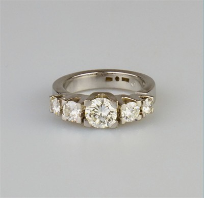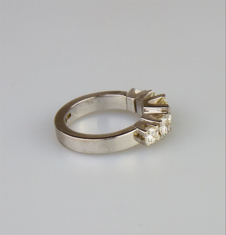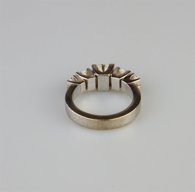 robustní prsten z bílého zlata s diamanty briliantového brusu, centrální diamant briliantového brusu o hmotnosti cca 1,10 ct, barva G-H, kvalita Si1, dále dva diamanty 0,33 ct a 0,35 ct v barvě G-H-I a výjimečné čistotě IF, celkem s dalšími dvěma kameny je na prstenu cca 2,24 ct diamantů, Au 11,58 g/750/1000, Švédsko, kolem r. 1995, individuální zakázková práce, pozdější český punc; znalecký posudek; velikost prstenu 56