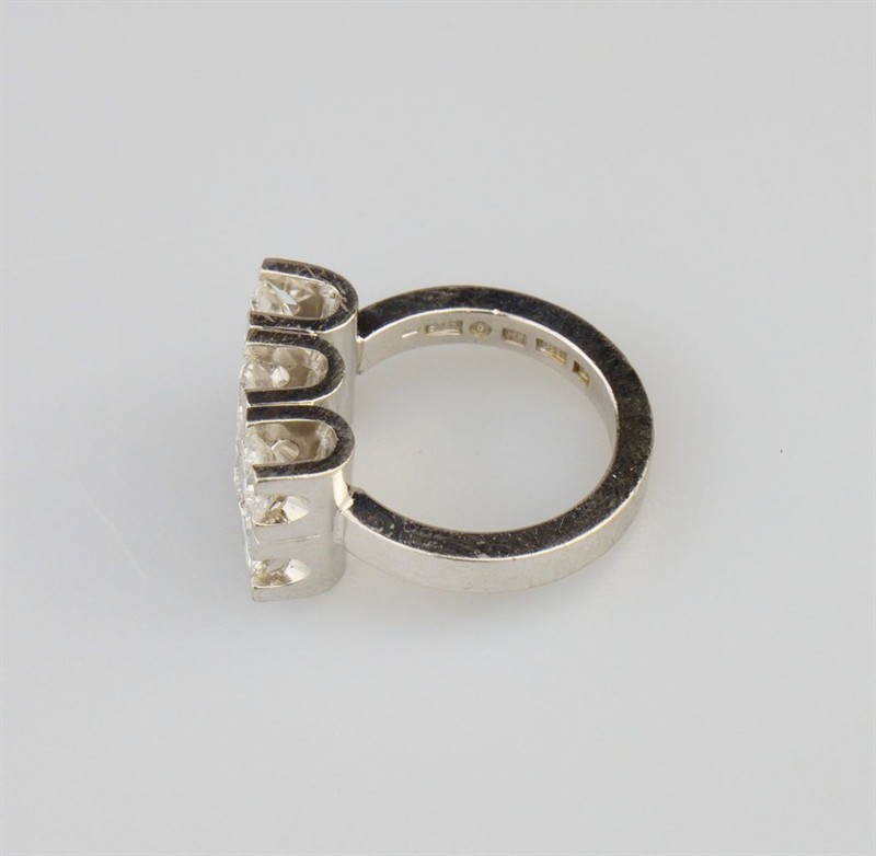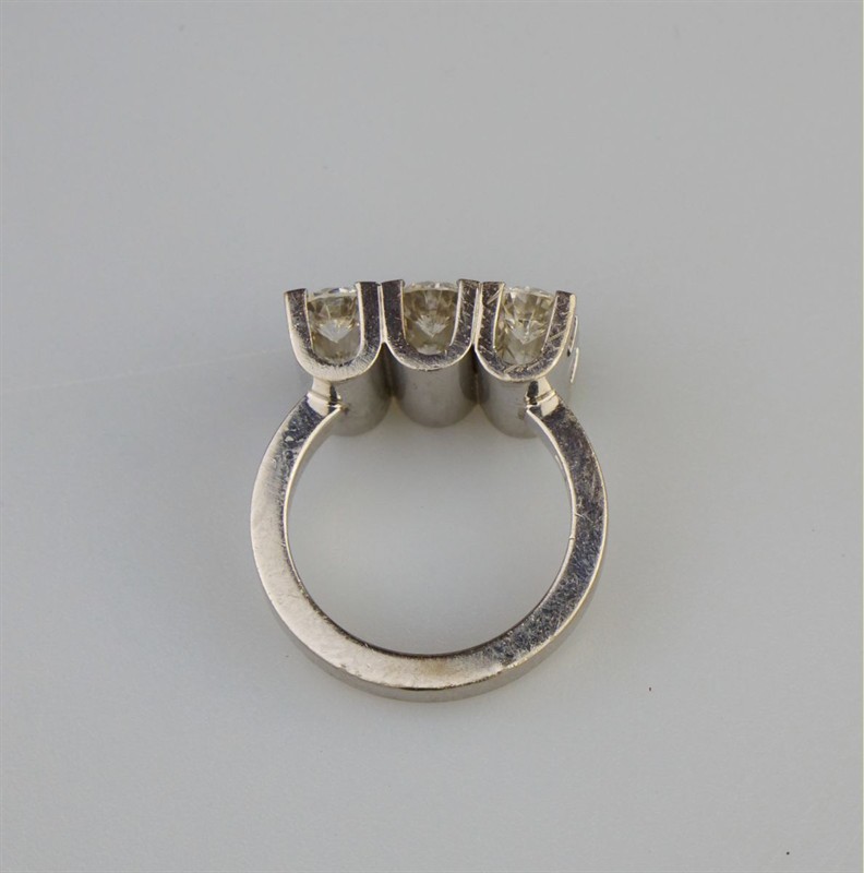 robustní prsten z bílého zlata se 6 diamanty briliantového brusu, Au 14,69 g/750/000, diamanty o celkové hmotnosti 3,03 ct, z toho 0,50 + 0,55 + 0,46 + 0,48 + 0,52 + 0,52, čistota VS1 + VVS2 + Si2 + Si1 + P1 + VVS1, barva H-I-J, Švédsko, kolem r. 1995, individuální zakázková práce, pozdější český punc (kohout), rozměry 2,53 x 2,21 x 1,17 cm; velikost prstenu 55; znalecký posudek,