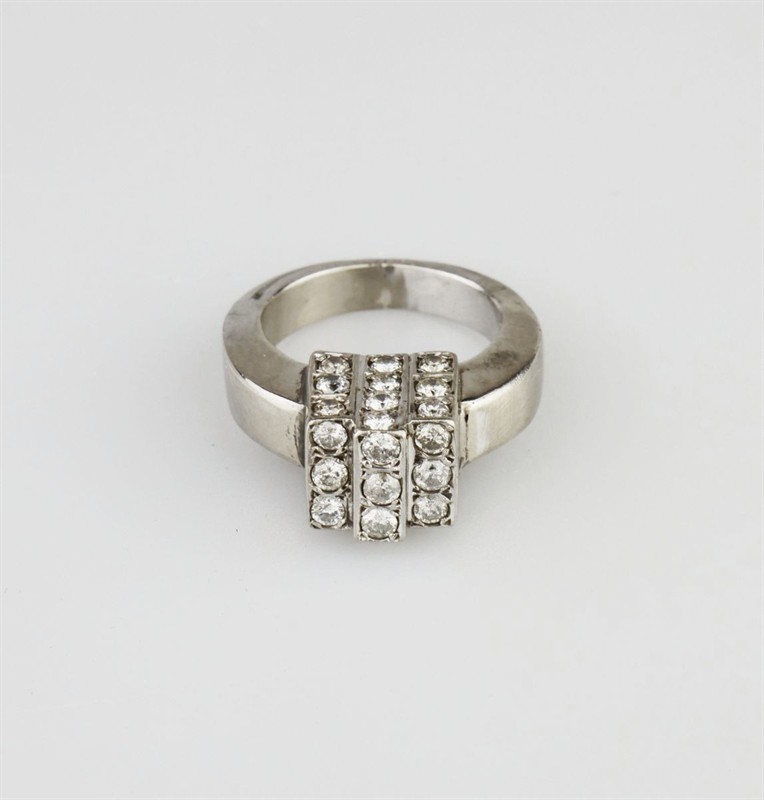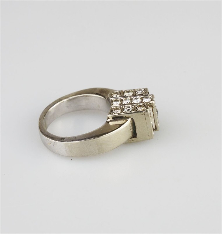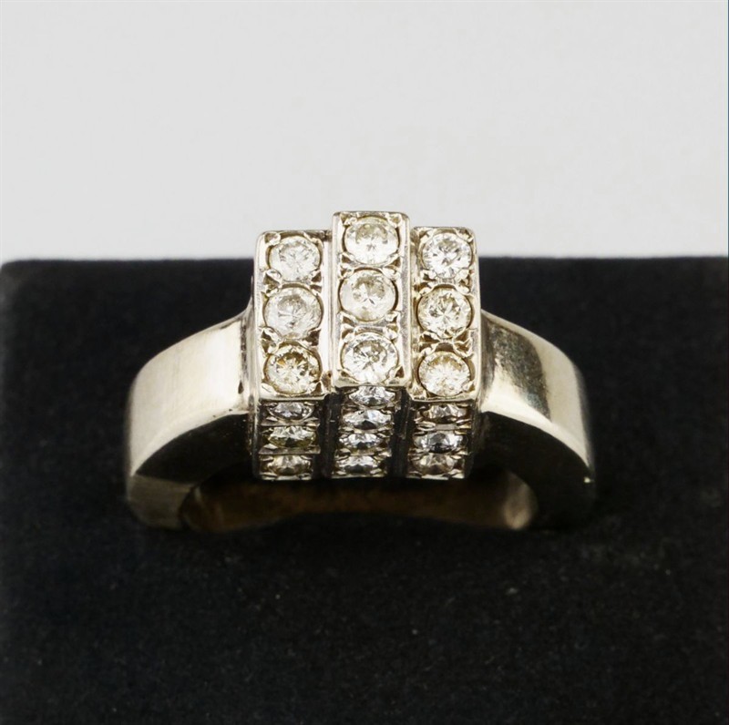 zlatý prsten s diamanty, 29 diamantů briliantového brusu o celkové hmotnosti cca 1,63 ct. Au 14,06 g/375/1000, Švédsko, kolem r. 1990, individuální design, atest Puncovního úřadu, znalecký posudek, rozměry prstenu 3,12 x 2,41 x 0,98, velikost prstenu 56