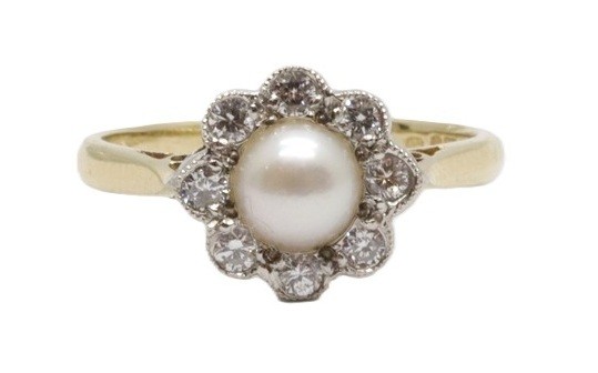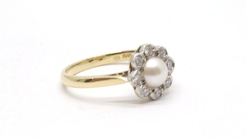 Zlatý prsten s diamanty a perlou. Bílé a žluté zlato 375/1000. Přírodní diamanty, kvalita SI1 - I1, barva H - J, celková váha 0,25 ct. Kultivovaná perla. Váha prstenu: 2,56 g. Velikost prstenu: 57.