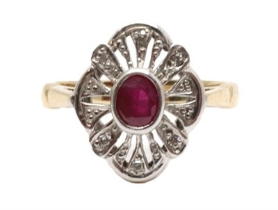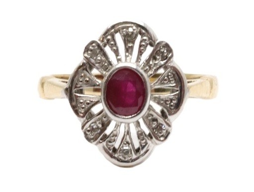 Zlatý prsten s diamanty a rubínem. Žluté a bílé zlato 375/1000. Přírodní rubín 0,35 ct. Přírodní diamanty, kvalita SI2 - I1, barva H - I, celková váha 0,05 ct. Váha prstenu: 3,21 g. Velikost prstenu: 52.