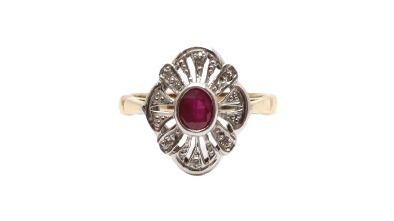 č. 180 052 Zlatý prsten s diamanty a rubínem