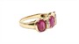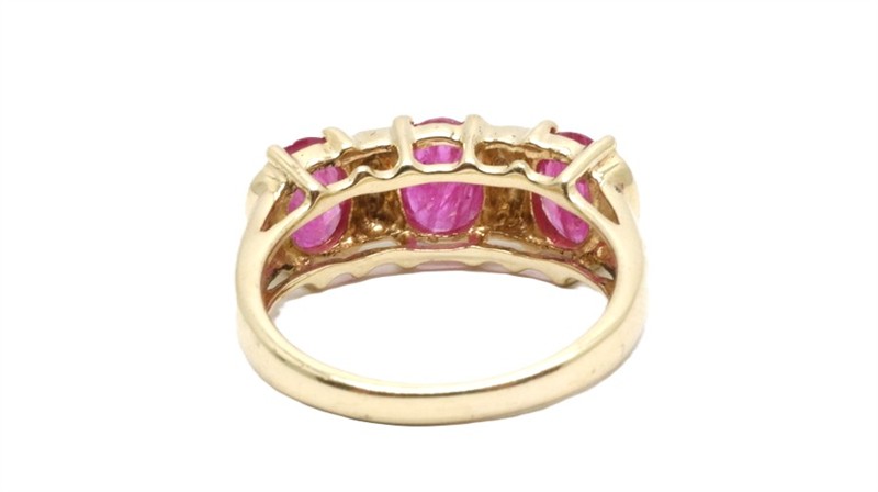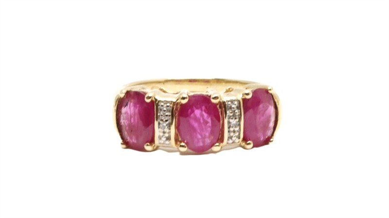 Zlatý prsten s diamanty a rubíny. Žluté zlato 375/1000. Přírodní rubíny, celková váha 1,7 ct. Přírodní diamanty, kvalita SI2, barva H - I, celková váha 0,01 ct. Váha prstenu: 3,63 g. Velikost prstenu: 51,5.